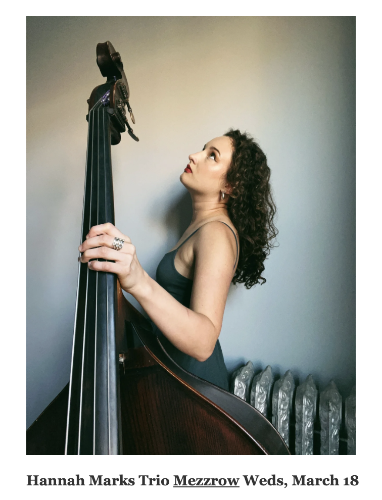 “Originally hailing from Des Moines, Iowa, Hannah Marks is an up-and-coming bass player and recent transplant to New York. “I’m very thankful for my Midwestern roots; I was afforded a lot of opportunities simply by growing in a smaller music scene,” she says. It was there that she started her first band as a leader, Heartland Trio, with fellow Indiana University students. With influences ranging from Kenny Garrett to Sonic Youth to Becca Stevens, Hannah’s compositional voice reflects her jazz and folk upbringing and juxtaposes it with elements of creative improvisation and rock music. The program for this show is particularly personal for her. “I wrote all this music in the past two years, and it’s very illustrative of my ups and downs in college,” the bassist says. “I’ve had several points where I’ve been tempted to move on from this set of music, but there’s a lot more crafting and experimenting that needs to happen before I can do so.” Her band chosen for this performance includes Sarah Rossy on vocals, Nathan Reising on alto saxophone, Jack Broza on guitar and Evan Hyde on the drums. “Everyone in this band is an incredible player and improviser, but what makes this group special is their understanding of me personally and my music,” Hannah says.”